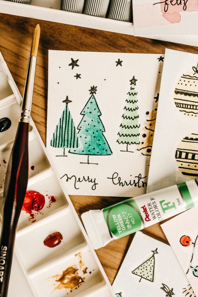 Do stworzenia własnoręcznie przygotowanego prezentu w postaci kartek świątecznych, potrzebujesz: kartki lub gruby papier, kolorowe długopisy, kredki, markery, naklejki, brokat, tasiemki, klej, nożyczki, stemple lub farby.